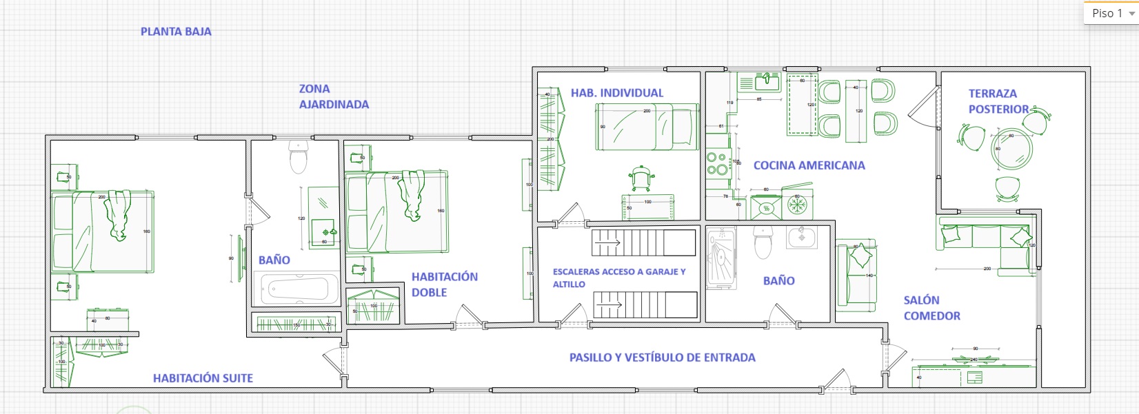 - Planta Principal: El corazón de la casa. Un luminoso salón-comedor se conecta con una moderna cocina americana abierta, creando un espacio diáfano y acogedor. Desde aquí, tienes acceso directo a un porche cubierto y al jardín, perfectos para disfrutar del aire libre. En este mismo nivel, se encuentra la zona de descanso con tres habitaciones dobles; una de ellas es una gran suite con vestidor y baño completo, mientras que las otras dos comparten otro baño con ducha.